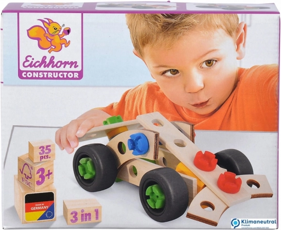 Seturile de construcție din lemn Eichhorn Constructor dezvoltă imaginația prin construirea diferitelor modele. Setul Mașină de curse 3 în 1 oferă distracție triplă și permite asamblarea a 3 modele: un monopost de Formula 1 și 2 mașini de curse diferite. Cu instrucțiunile incluse, puteți asambla cu ușurință modelele alese. Setul conține 35 de piese, precum blocuri, piese turnate, roți, șuruburi și piulițe. Calitate Fabricat în Germania. Datorită colțurilor și marginilor rotunjite, materialelor fără substanțe nocive și plastifianți, precum și controlului calității, asigurăm jucării de cea mai înaltă calitate. 100 Lemn certificat FSC. Pentru producția modelelor Constructor se folosește exclusiv lemn de fag certificat. Număr licență: FSC-C005308. Prin joc, copiii învață gândirea spațială și își antrenează abilitățile motorii încă de la vârste fragede. Jucăria de construcție este potrivită pentru copii de la 3 ani.