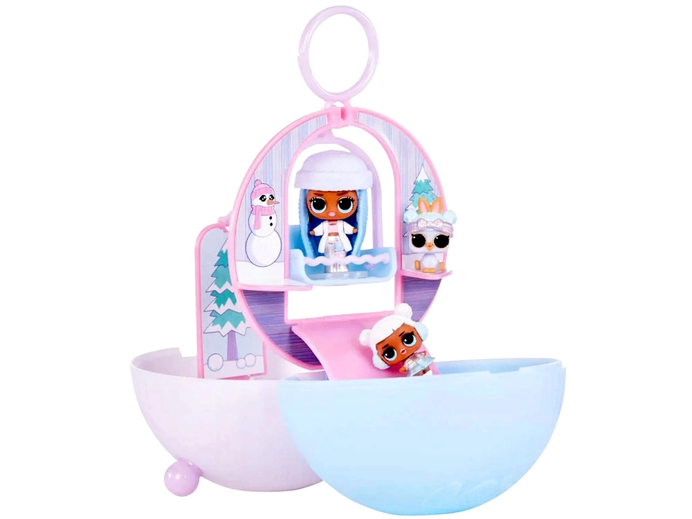 După deschidere, mingea se transformă într-o mini căsuță de iarnă cu decorațiuni de zăpadă – decorul ideal pentru povești cu păpușile și animăluțele lor.