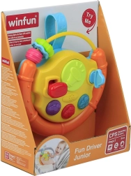 Datorită curelei practice, jucăria se fixează ușor pe pătuț, scaunul auto sau cărucior. Contactul de pornire rotativ cu cheiță, butoanele funcționale și elementele rotative prelungesc timpul de joacă și ajută la dezvoltarea auzului, văzului și a abilităților motorii.