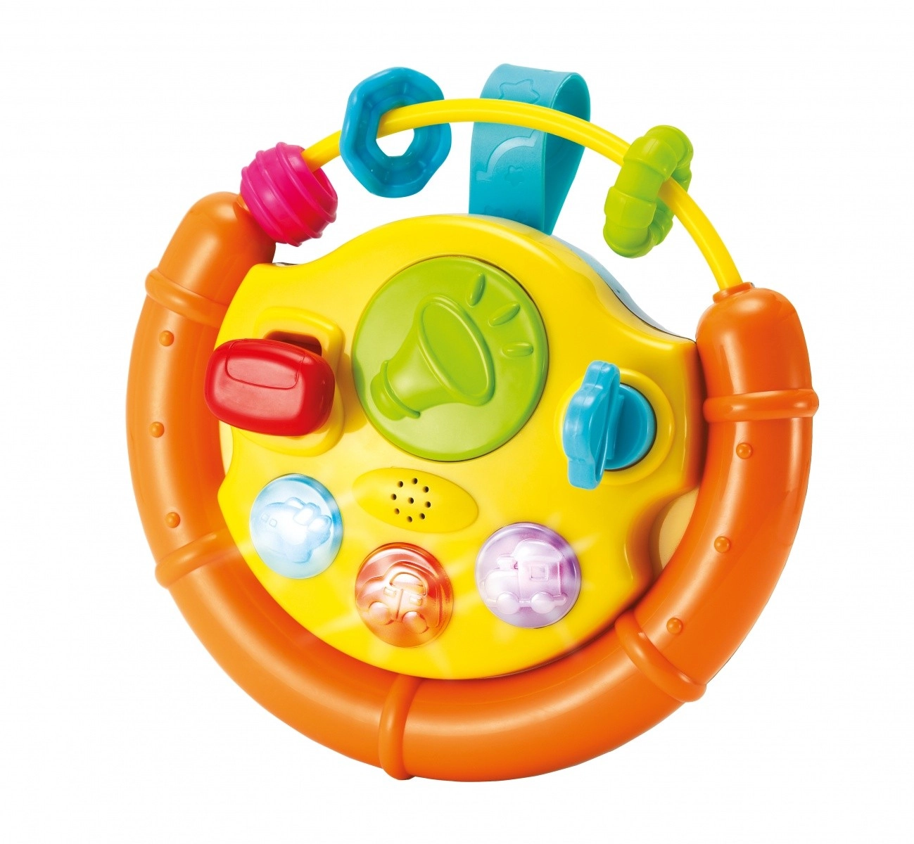 Elementele rotative și apăsabile, contactul cu cheiță și comutatoarele antrenează degețelele și coordonarea copilului.