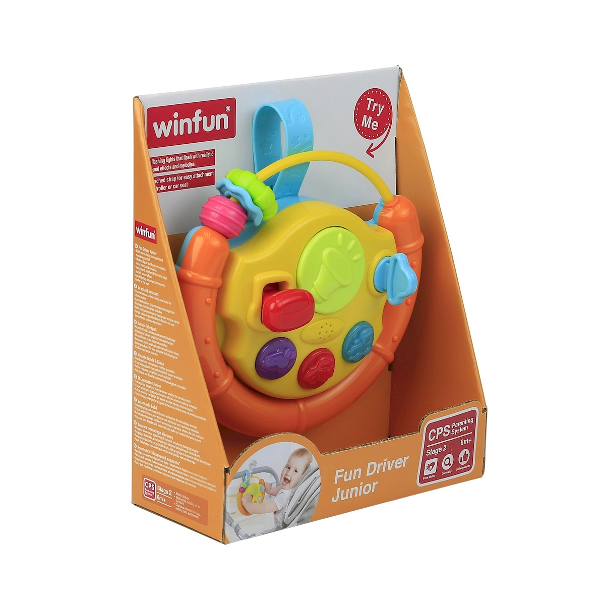 Acest volan colorat este o jucărie de activare ideală pentru cei mici. Copiii sunt atrași de luminile clipitoare, melodiile vesele și diferitele stimuli tactili. Părțile mobile precum biluța, mașinuța sau peștișorul invită la explorare și exersează prinderea și coordonarea mână–ochi.