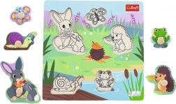Setul de asamblare din lemn Animăluțe de câmp este conceput pentru mânuțele copiilor mici. Cele cinci piese robuste cu butoane din lemn se prind comod și se așază în suportul cu forme frezate. Fiecare locaș are o ilustrație alb-negru corespunzătoare, care îi indică copilului unde se potrivește fiecare piesă.