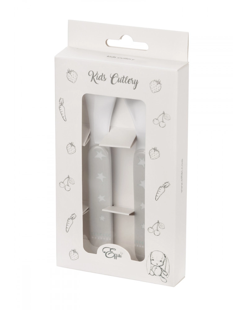 Furculița și lingura cu mânere gri decorate cu stele atrag atenția prin aspectul lor vesel și designul simplu.