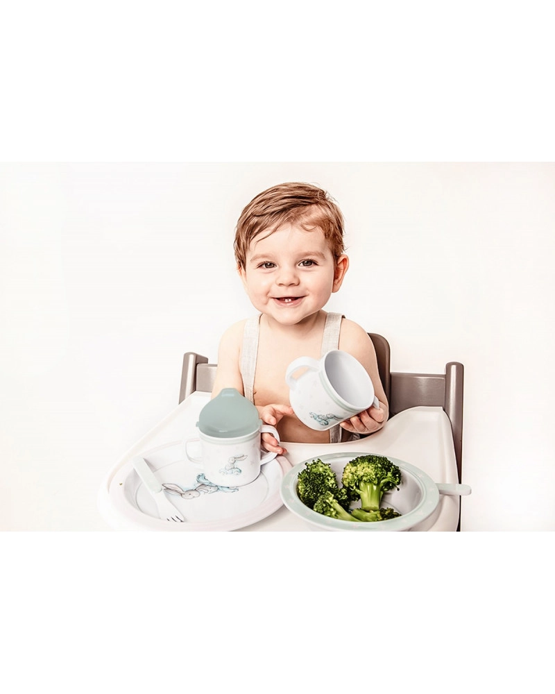 Cauciucul antiderapant de pe tacâmuri asigură o prindere fermă pe masă, ideal pentru copiii mici care învață să mănânce singuri.
