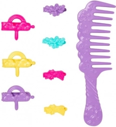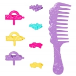Clame colorate, agrafe și un pieptene lat facilitează descurcarea și fixarea fermă a noilor coafuri, fără smulgere.