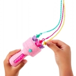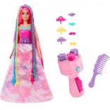 Păpușa Barbie din tărâmul de basm Dreamtopia are păr extra lung cu șuvițe curcubeu, care invită la coafat. Doar introdu 2–3 șuvițe în aparatul de împletit și creează coafuri răsucite fermecătoare printr-o singură apăsare. Trei clame curcubeu mențin coafura la locul ei, iar agrafele colorate definitivează lookul final.