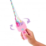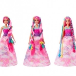 Păpușa, în rochie sclipitoare cu steluțe, are păr extra lung, multicolor, ideal pentru styling și joaca de-a coaforul.