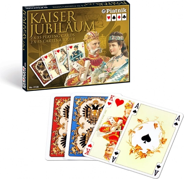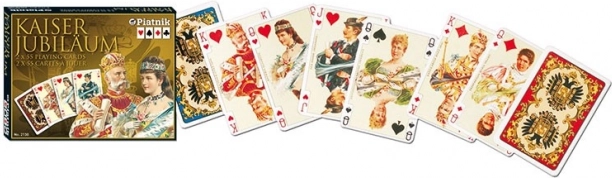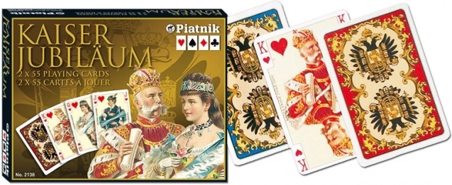 Cărțile Imperiale 'Kaiser' de la renumita companie Piatnik vă vor fascina cu designul lor clasic, care a fost popular încă din perioada interbelică în regiunea Galiția. Acest set conține două pachete luxoase de cărți, oferind 54 de cărți plastificate în fiecare pachet cu o greutate de 310 g/m² și dimensiuni de 58 x 89 mm. Pe fața cărților veți găsi portrete ale membrilor familiei imperiale Habsburg, iar spatele poartă stema acestei familii.