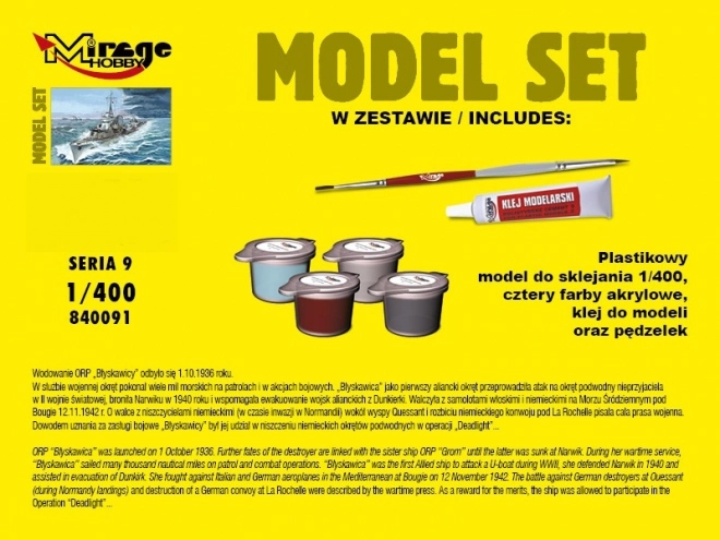 Setul conține un model de navă din plastic pentru asamblare.