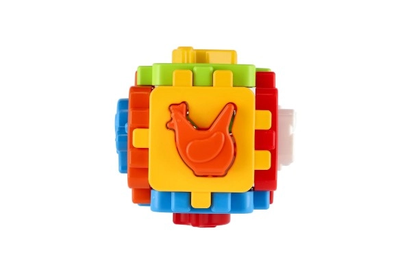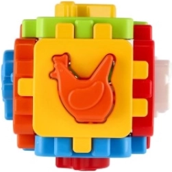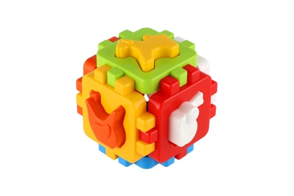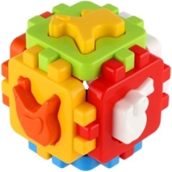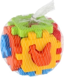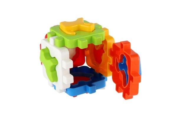Acest joc clasic de potrivire, în versiune mini, are șase fețe colorate cu margini zimțate de îmbinare, care se pot asambla ușor într-un cub. Include forme de inserat și panouri de asamblare, astfel încât copilul poate demonta și reasambla cubul, dezvoltând coordonarea mână–ochi și imaginația spațială.