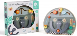 Placa este realizată din lemn de calitate, cu elemente din plastic rezistent, și este finisată cu vopsele netoxice. Datorită dimensiunilor practice, este ideală pentru mașină, cărucior și pentru acasă. Jucăria susține învățarea prin joc și, datorită multitudinii de elemente, menține atenția copiilor pentru mult timp.