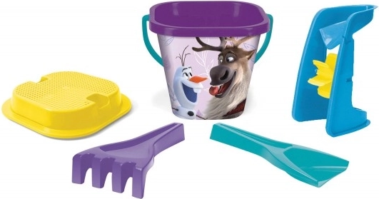 Set distractiv pentru nisip cu îndrăgitul motiv FROZEN (Regatul de Gheață), care îi va încânta pe micii constructori de la 12 luni. Conține găletușă, lopățică, greblă, sită și moară pentru jocuri nesfârșite cu nisipul. Dimensiunile compacte asigură transport și depozitare ușoare.