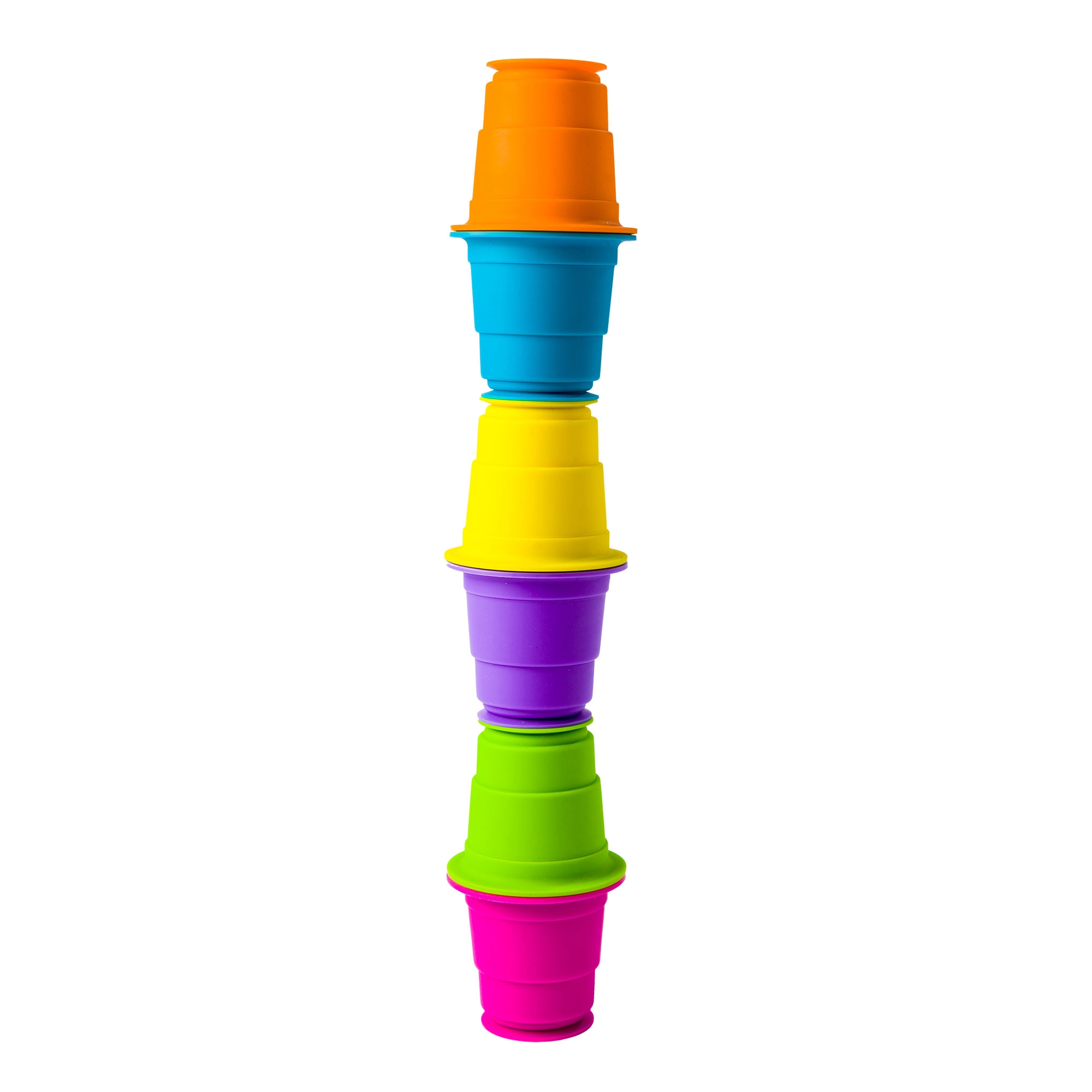 Cănuțele din silicon cu ventuză SUCTION KUPZ, în set de 6 bucăți, oferă copiilor un joc creativ plin de descoperiri. Fiecare cănuță poate fi fixată pe suprafețe netede (masă, cadă, frigider) sau stivuită într-un turn. Datorită siliconului moale și sigur, sunt plăcute în mână, se curăță ușor și rezistă utilizării zilnice.
