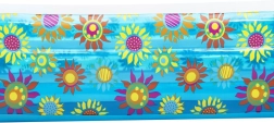 Piscina gonflabilă este decorată cu un model floral vibrant, care îi adaugă atractivitate și invită la joacă și relaxare.