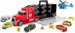 - Conținutul setului: camion cu remorcă, 5 mașinuțe, 1 elicopter