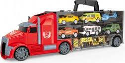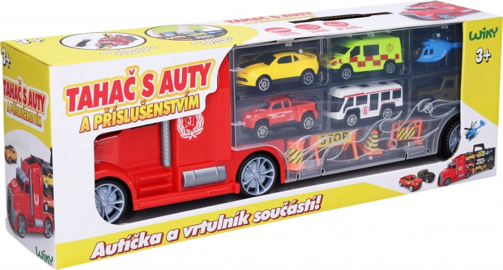 Un camion transportor mare cu mașinuțe și elicopter, cu lungimea de 42 cm, le oferă copiilor de la 3 ani multă distracție. Datorită roților cu rulare liberă, trecerii mașinuțelor prin cabină și compartimentelor de pe ambele părți ale remorcii, micii șoferi se vor bucura de joacă creativă. Nu lipsește mânerul extensibil pentru transport facil și ambalajul în limba cehă.