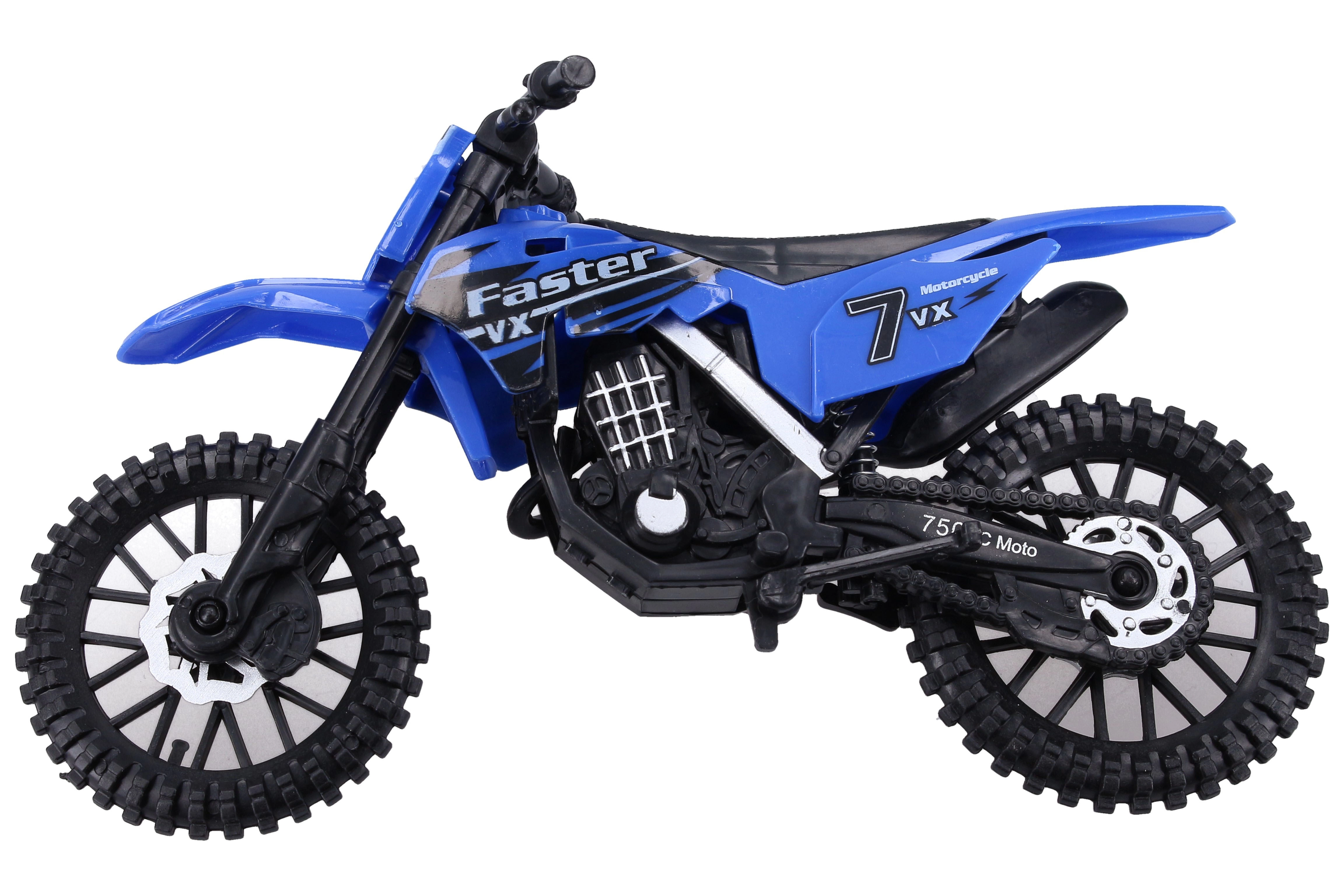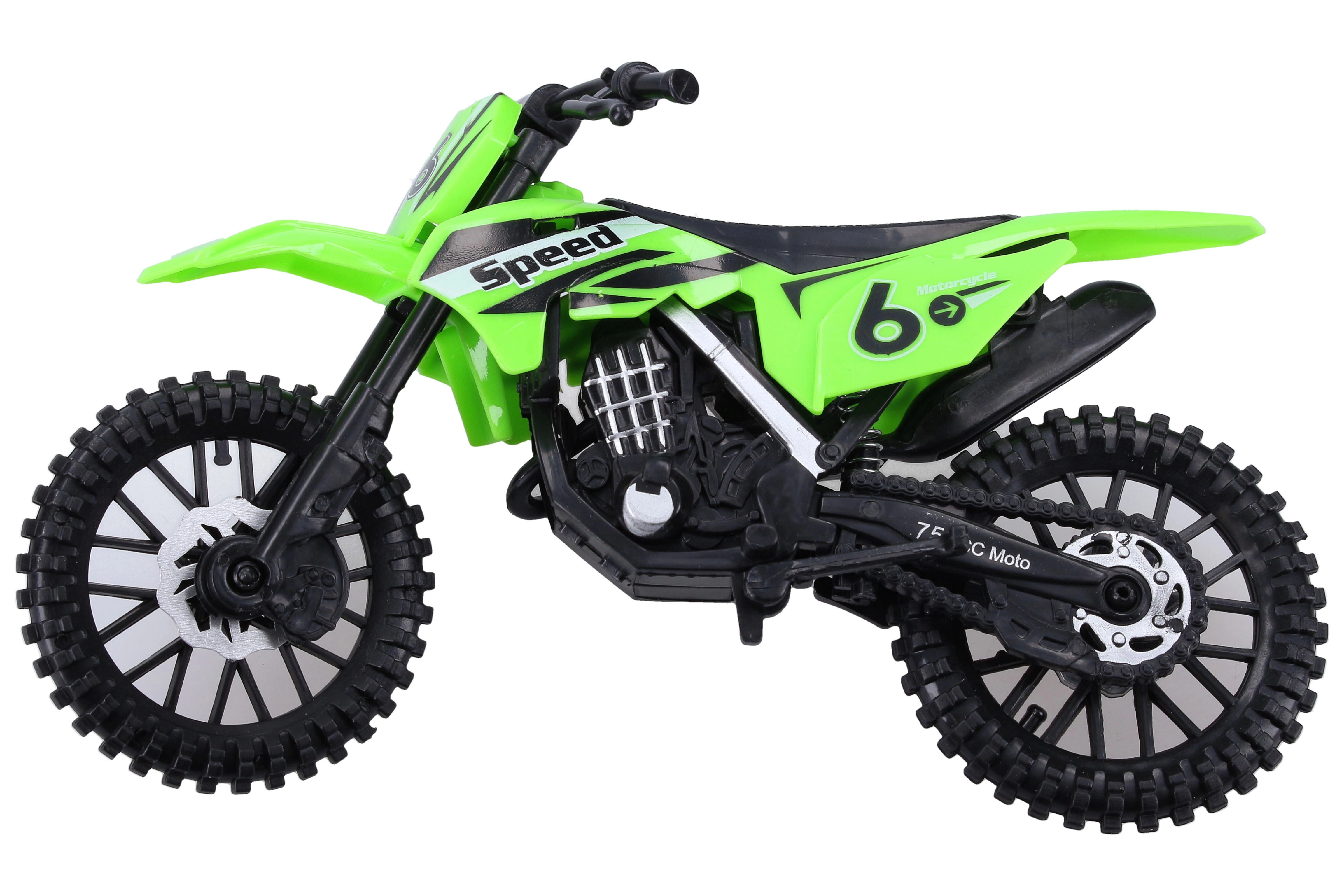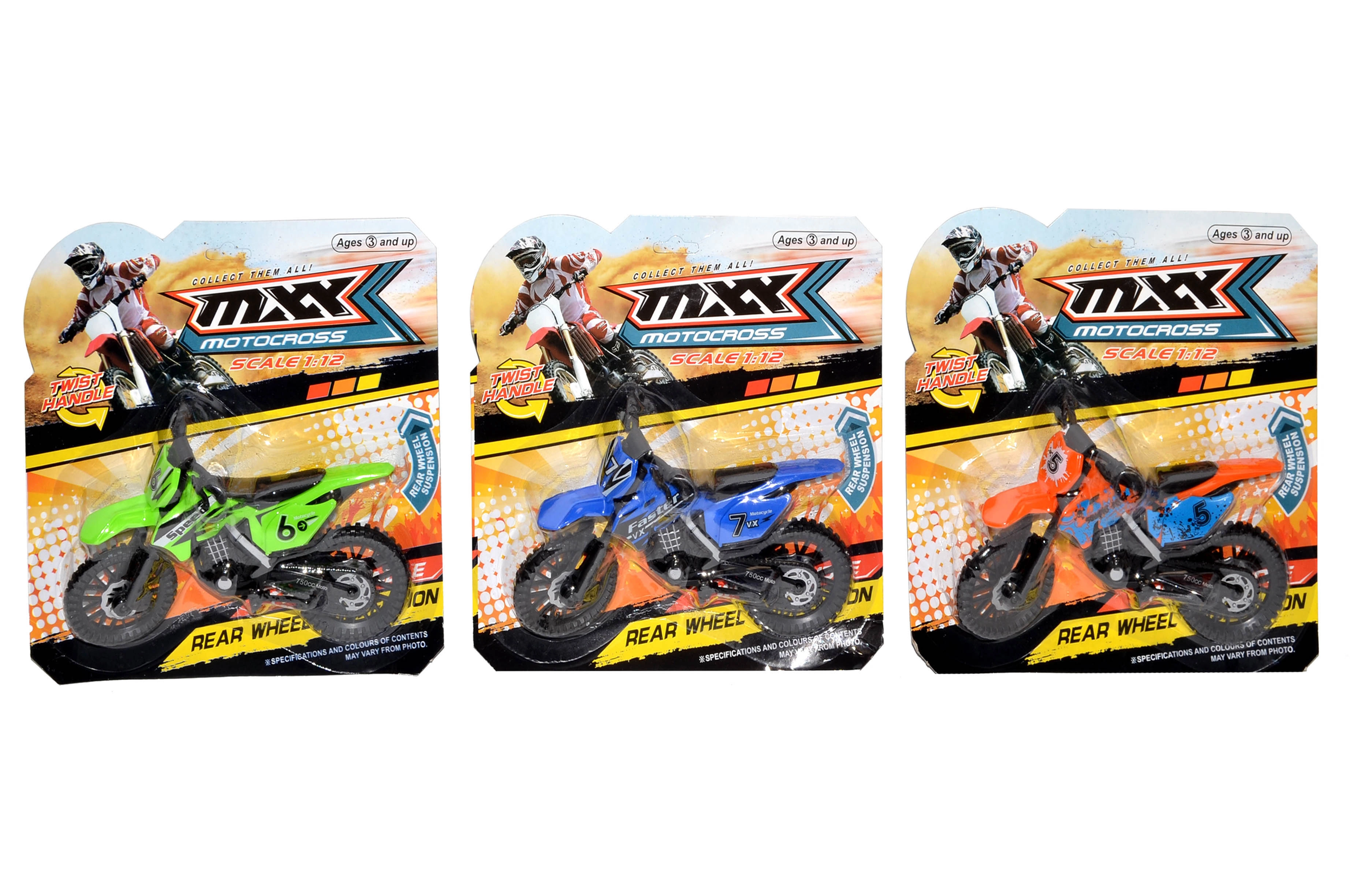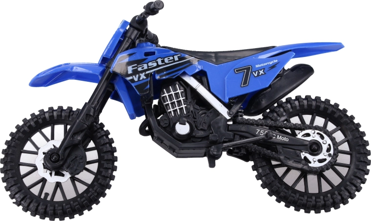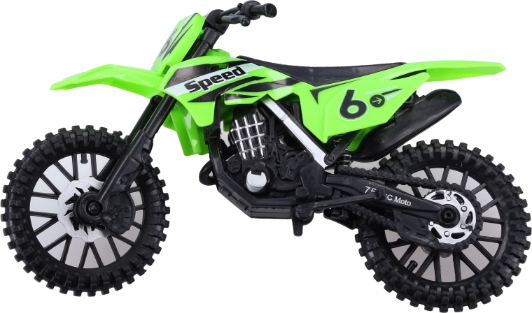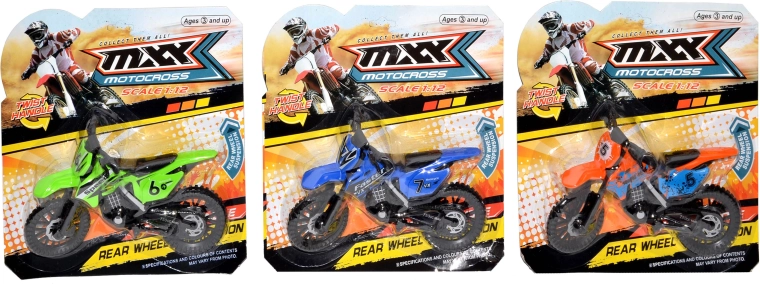 Motocicleta este disponibilă în 3 variante de culoare cu grafici de curse (numere, inscripții) și un stil off-road impresionant. Dimensiunea compactă de 19 cm se potrivește perfect în mâna copilului și în rucsacul pentru călătorii.