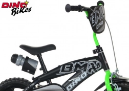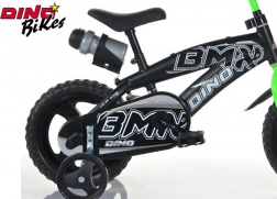Bicicleta ușoară și rezistentă pentru copii BMX 12 de la Dino Bikes, pentru micii concurenți, oferă anvelope pline, fără cameră împotriva penelor, transmisie fixă (furtșlap) pentru porniri ușoare și roți ajutătoare pentru învățare în siguranță.