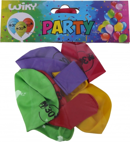 Set de 5 baloane din latex, 30 cm, în mix de culori, cu numărul 30. Decorațiune ideală pentru a 30-a aniversare sau jubileu. Pot fi umflate cu aer sau heliu.