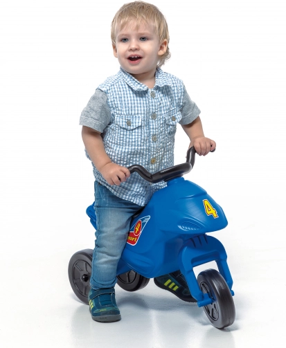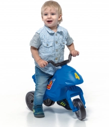 Vehicul de împins cu trei roți, ușor, SUPER BIKE mini în culoarea albastră, pentru primele plimbări. Oferă stabilitate datorită celor 3 roți, dimensiuni compacte 57×28×41 cm și capacitate de încărcare 25 kg.