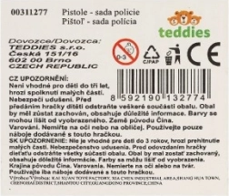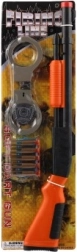 Setul include tot ce este necesar pentru joaca de-a polițistul, incluzând pușca, gloanțele, cătușele și insigna.
