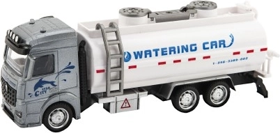 Modelul autocisternei de stropit, cu cabină gri și rezervor alb, oferă posibilitatea unui joc tematic cu elemente acvatice.
