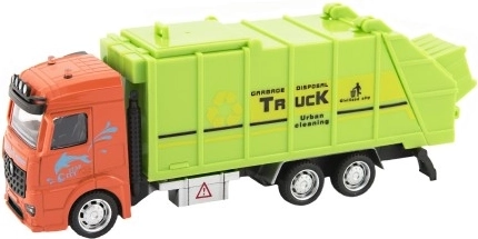 Această mașină de gunoi, cu cabină portocalie și caroserie verde, aduce în joc elemente de întreținere urbană.