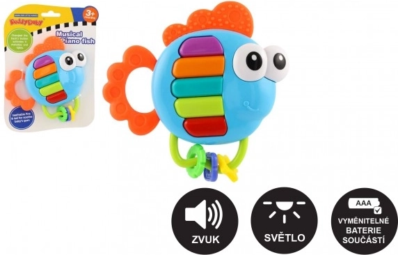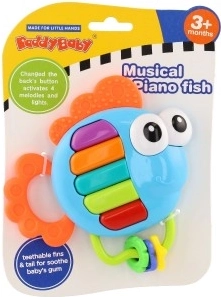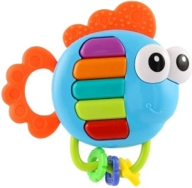 Zornăitoare muzicală și jucărie de dentiție în formă de peștișor, pentru cei mai mici, de la 3 luni. La apăsarea clapelor redă melodii și note individuale, iar clapele luminează. Din plastic pentru curățare ușoară, cu baterii incluse în pachet și cu blocare de siguranță.
