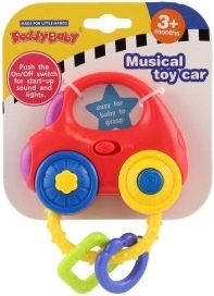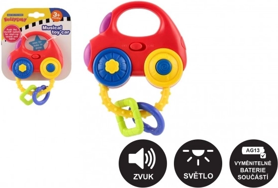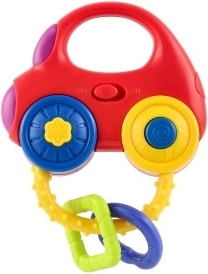 Mașinuța–zornăitoare colorată oferă copiilor distracție și stimuli pentru dezvoltarea auzului, văzului și motricității fine. Este suficient să o scuturi sau să apeși butoanele, iar jucăria aprinde luminițele, redă melodii și sunete realiste de pornire, mers și claxon. Dimensiunile compacte de 10 × 11 cm și formele rotunjite facilitează prinderea chiar și de către cei mai mici.