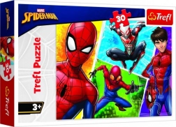 Puzzle-ul conține ilustrații viu colorate cu Spider-Man și personaje ca Miguel, ideal pentru micii fani ai benzilor desenate.