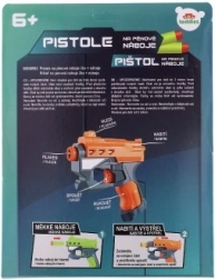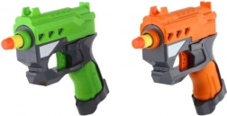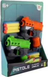 Execuția din plastic de calitate, în culori atractive (portocaliu și verde), este ușoară, rezistentă și nu necesită baterii. Pachetul include 2 pistoale și 6 proiectile, astfel că aveți totul pentru un duel corect imediat după despachetare.