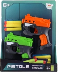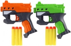 Acest set de la marca Teddies aduce un joc de acțiune sigur pentru copii și frați/surori. Proiectilele moi din spumă se introduc ușor în țeavă; este suficient să armați manual și să țintiți. Datorită dimensiunii compacte de 12 cm, pistoalele se țin confortabil chiar și de către cei mai mici, iar joaca poate începe în câteva secunde.