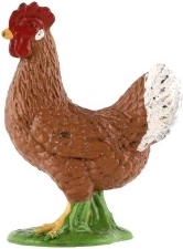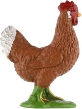 Această figurină de găină, realizată în detaliu (găină domestică), redă fidel forma corpului, textura penajului și coloritul tipic, cu accente albe pe coadă și creastă roșie. Datorită dimensiunii compacte de cca 4 cm și bazei verzi, se plasează ușor pe raft, în diorame, ferme în miniatură sau proiecte școlare.