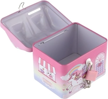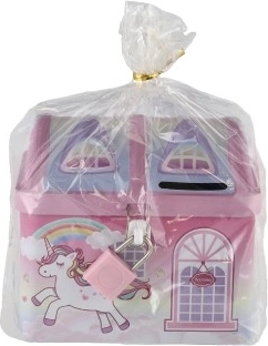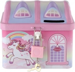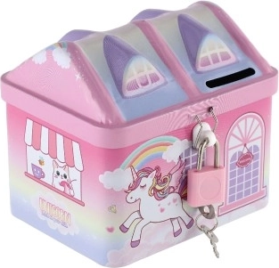 Pușculița distractivă și colorată în formă de căsuță este un cadou minunat pentru copii, care doresc să-și păstreze economiile în siguranță. Această căsuță metalică cu motiv unicorn și curcubeu nu doar că protejează comorile, dar și decorează camera copilului.