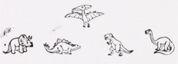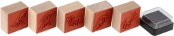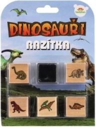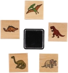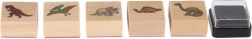Cinci ștampile din lemn cu motive de dinozauri și o tușieră în pachet – doar deschizi și începi să ștampilezi.
