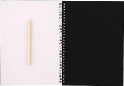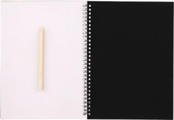 Caietul are format de aprox. 19 × 26 cm și este legat cu spirală pentru o răsfoire comodă. În pachet găsești 10 foi și un bețișor zgâriabil din lemn, astfel încât poți începe să creezi imediat după deschidere.