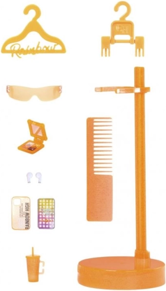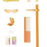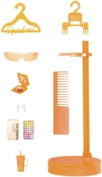 Păpușa vine cu o mulțime de accesorii stilate, incluzând un pieptene, ochelari de soare, umerașe, o paletă de machiaj și un pahar de băuturi, ceea ce o face un loc minunat pentru stilizat și joacă.