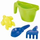 Camion cu lungimea de 33 cm care include stropitoare, greblă, lopățică și formă pentru nisip, ideal pentru jocurile copiilor în aer liber.