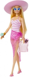 Păpușa Barbie poartă un costum de baie în dungi roz-albe și un sarong transparent cu buline, care adaugă eleganță.