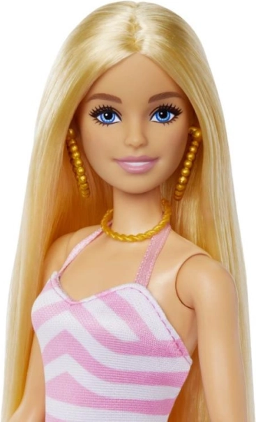 Această păpușă Barbie fermecătoare este pregătită pentru aventurile de plajă cu accesoriile ei stilate. Este îmbrăcată într-un costum de baie în dungi roz-albe și un sarong transparent cu buline, care adaugă eleganță. Barbie poartă cercei de aur și sandale roz elegante, care completează perfect aspectul ei.