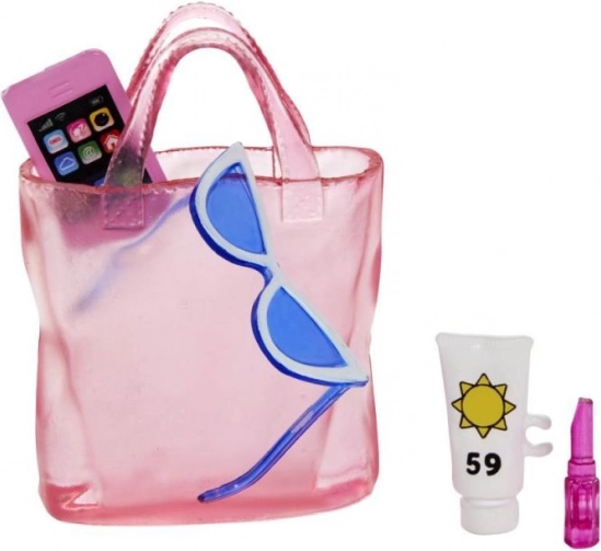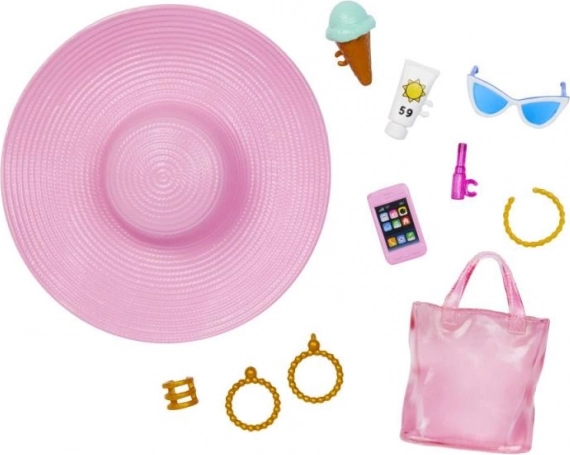 Completează stilul Barbie cu o pălărie cu margine largă, ochelari de soare tip pisică și o geantă roz plină de lucruri de plajă.