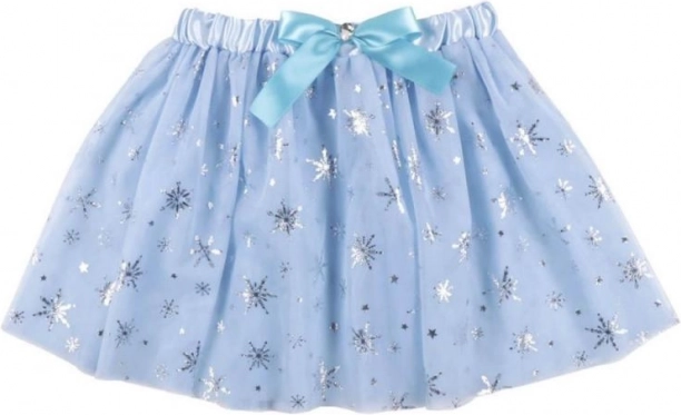 Frumoasă fustiță pentru fetițe, cu licență Frozen. Fustița pufoasă este decorată cu fulgi de zăpadă sclipitori și are un tiv din satin în talie, cu o fundiță. Setul include și o bentiță. Potrivită pentru fetițe de la 6 ani.