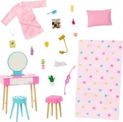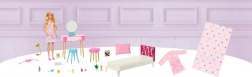 Acest dormitor bogat dotat cu păpușa Barbie transformă orice joacă într-o relaxare plăcută și povești amuzante. Include pat cu plapumă, noptieră și măsuță de toaletă cu oglindă, datorită cărora copiii pot reinterpreta cu ușurință pregătirile de dimineață și liniștea de seară.