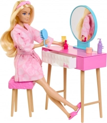 Barbie se poate pieptăna, aranja și pregăti pentru zi. Nu lipsesc pieptenele, sticluțele și sertarul pentru mărunțișuri, pentru o organizare ordonată.