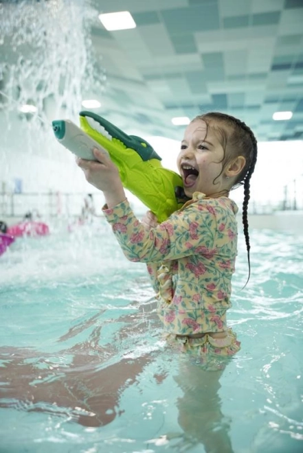 Pistolă cu apă în formă de dinozaur, cu recipient pentru apă. Pistolul are 40 cm lungime.