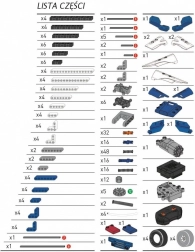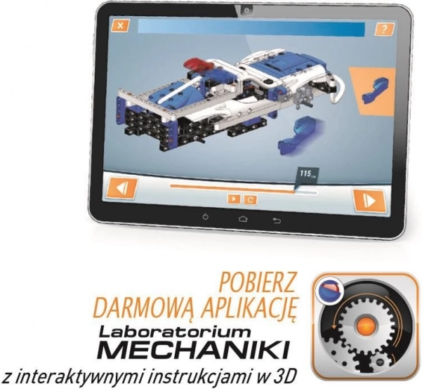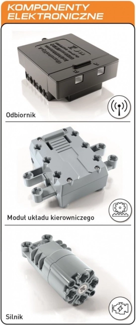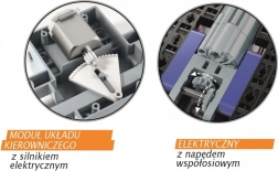 - Conține peste 300 de componente pentru asamblare, două motoare electrice pentru antrenarea roților din spate și un volan, cutii de viteze și o unitate de transmisie. Mașinile pot fi controlate cu o telecomandă.