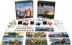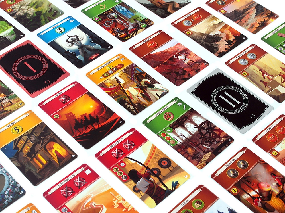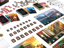 Planșe colorate ale minunilor, mai multe pachete de cărți, monede, jetoane de conflict și foi de referință. Totul cu simboluri clare pentru învățare rapidă și joc fluent.