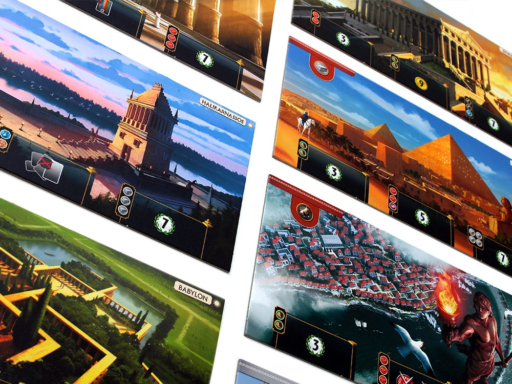 Fiecare jucător conduce propriul oraș cu un Monument al Lumii unic împărțit în mai multe etape. Finalizarea lor aduce bonusuri puternice, efecte speciale și puncte suplimentare. Datorită iconografiei clare, cărților bine structurate și planșelor de joc solide, învățarea este ușoară iar jocul curge fluent.