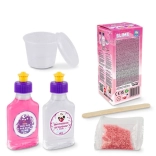 Realizarea este foarte simplă: măsoară adezivul și activatorul, adaugă glitter, amestecă bine și frământă până când slime-ul se îngroașă la consistența ideală. După joacă, păstrează slime-ul în recipientul inclus pentru a-și menține proprietățile pentru mult timp.
