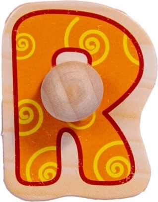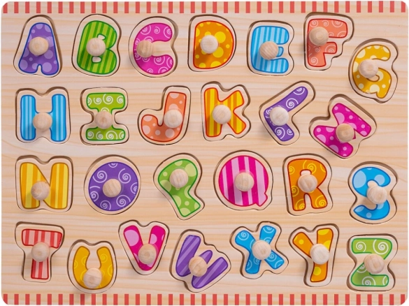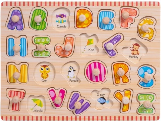 Puzzle-ul din lemn Alfabet cu mânere este o jucărie educativă excelentă care ajută copiii să recunoască formele și ordinea literelor din alfabet. Placa conține decupaje sub forma literelor în care copiii își plasează piesele colorate corespunzătoare. Fiecare piesă are un mic mâner pentru o manipulare ușoară, ceea ce întărește abilitățile motorii fine și coordonarea ochi-mână. Asocierea literei corecte cu cuvântul englezesc și ilustrația de pe placă sprijină, de asemenea, învățarea prin asocierea vizuală.